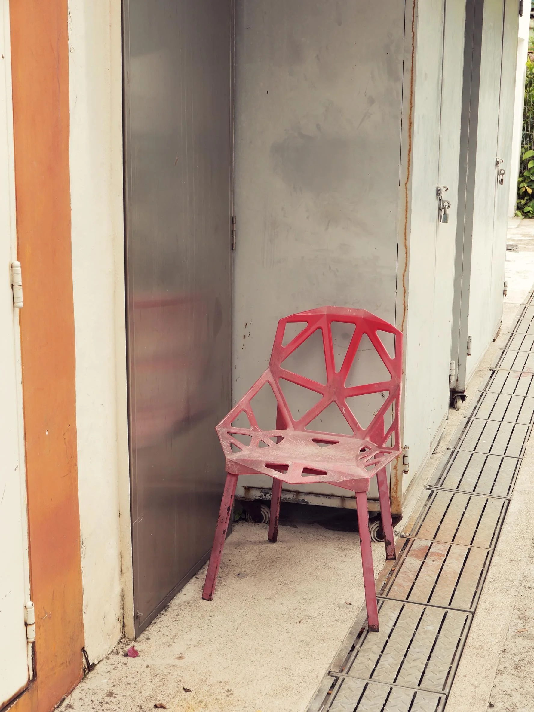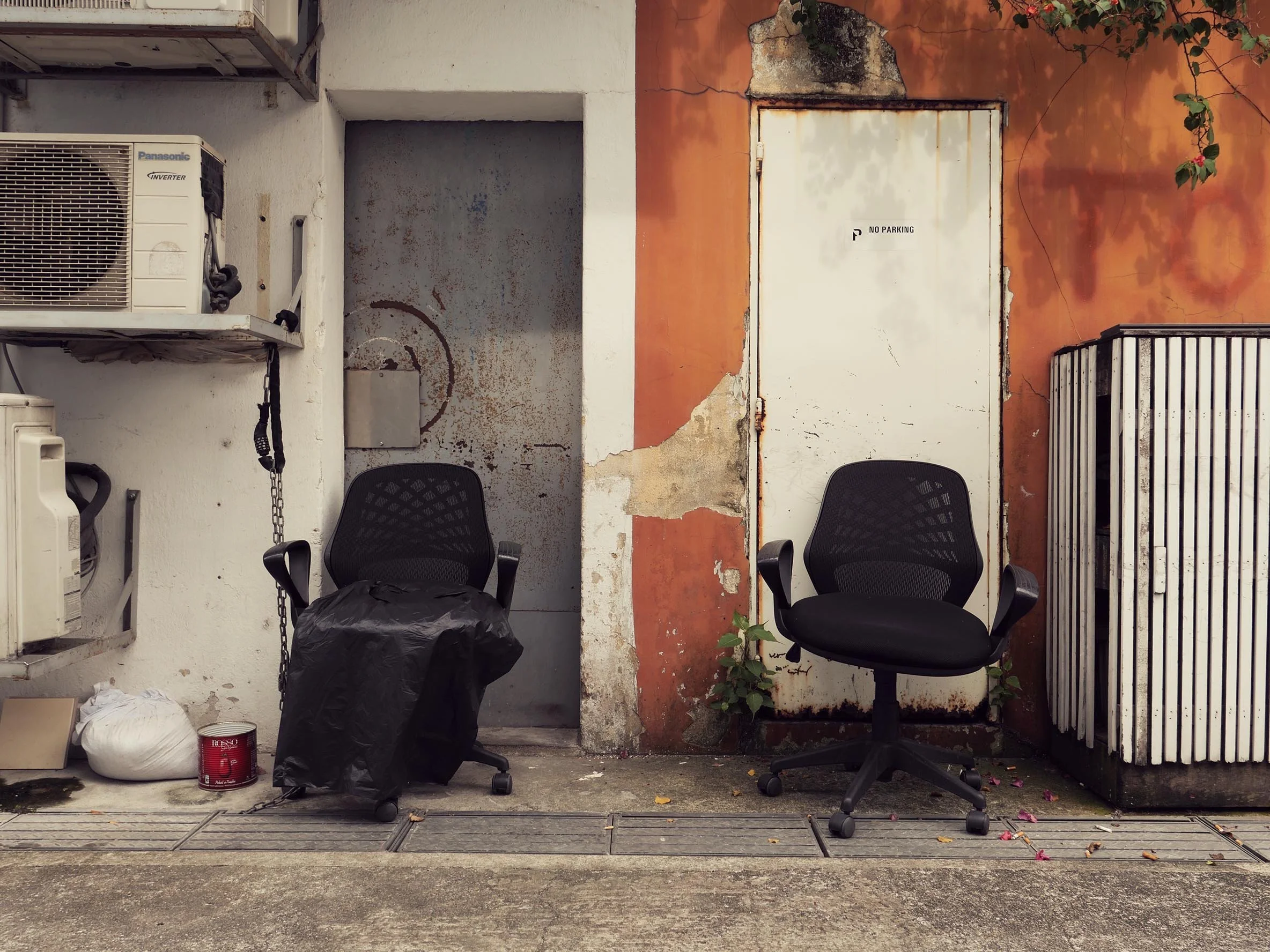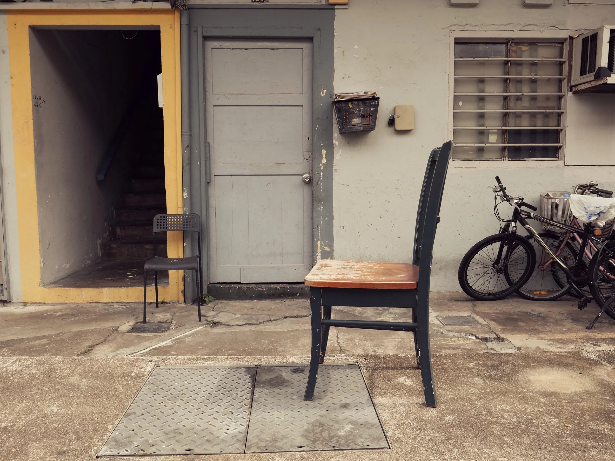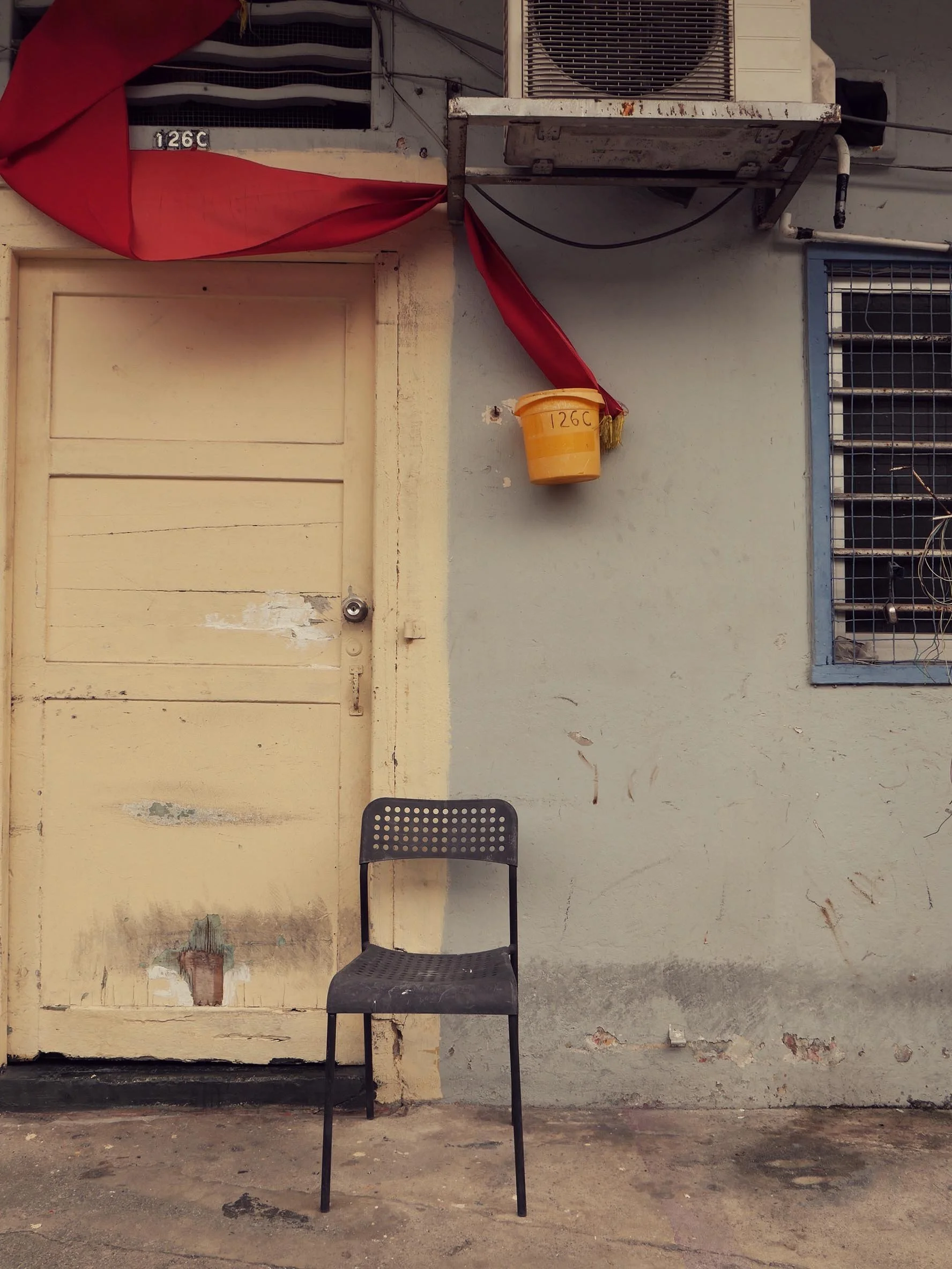 Shifting Seats is a photographic observation of the humble chairs scattered through the backstreets of Singapore. Used by workers during brief pauses in the day such as morning kopi breaks, mid-shift rest or end-of-day conversations, these chairs carry the marks of repeated use: worn plastic, repaired legs, dents, grime, paint rubbed thin.