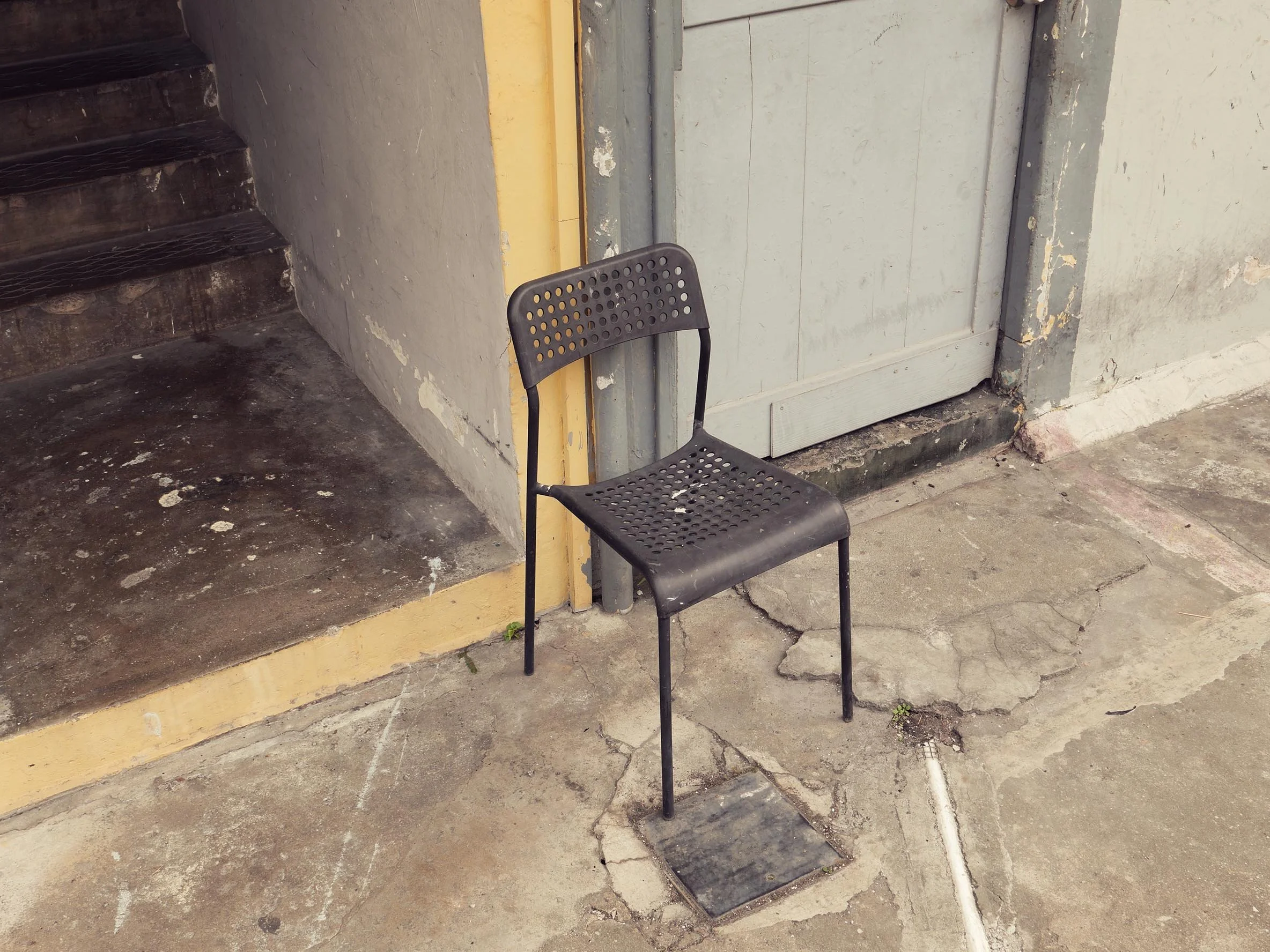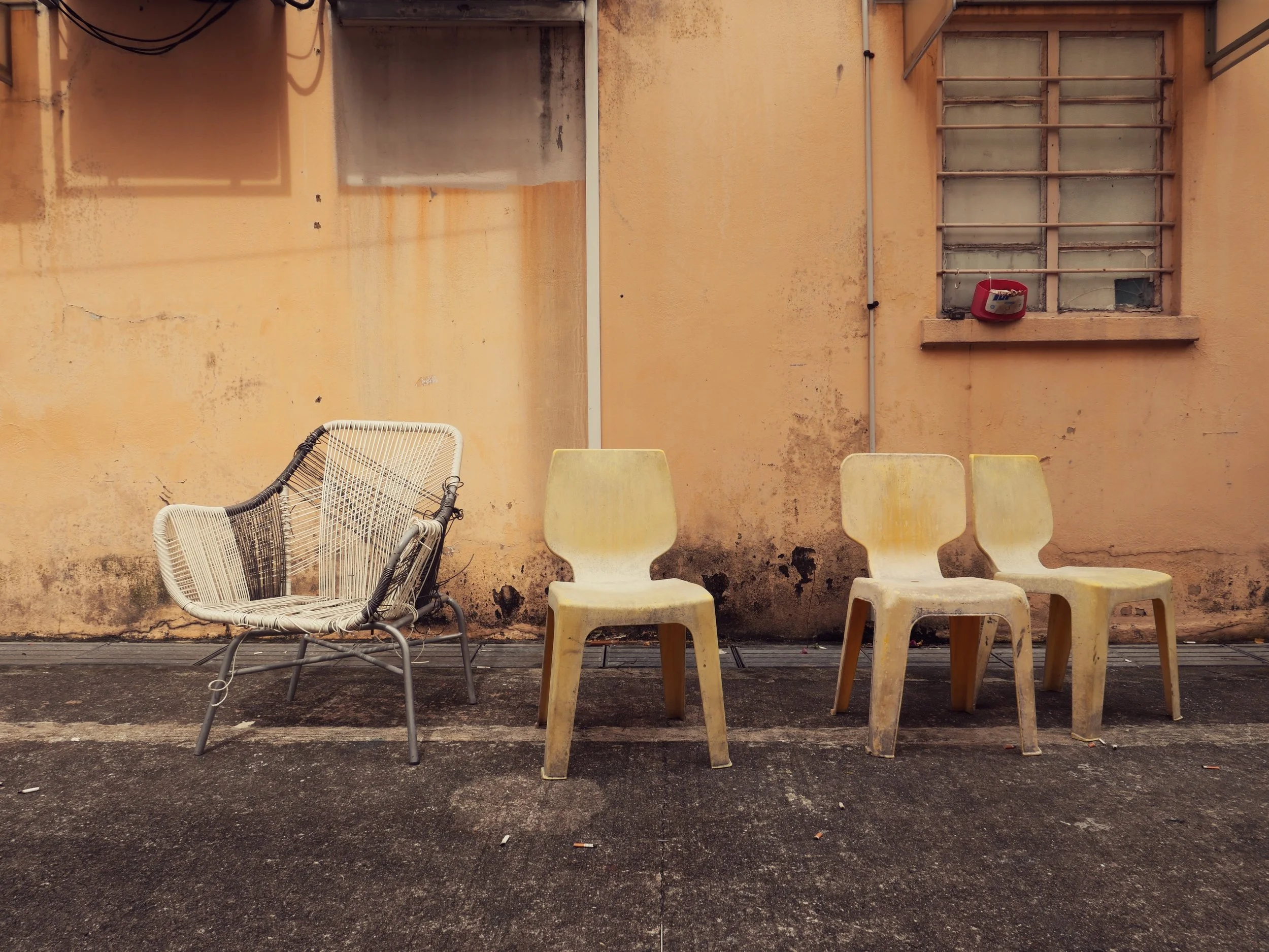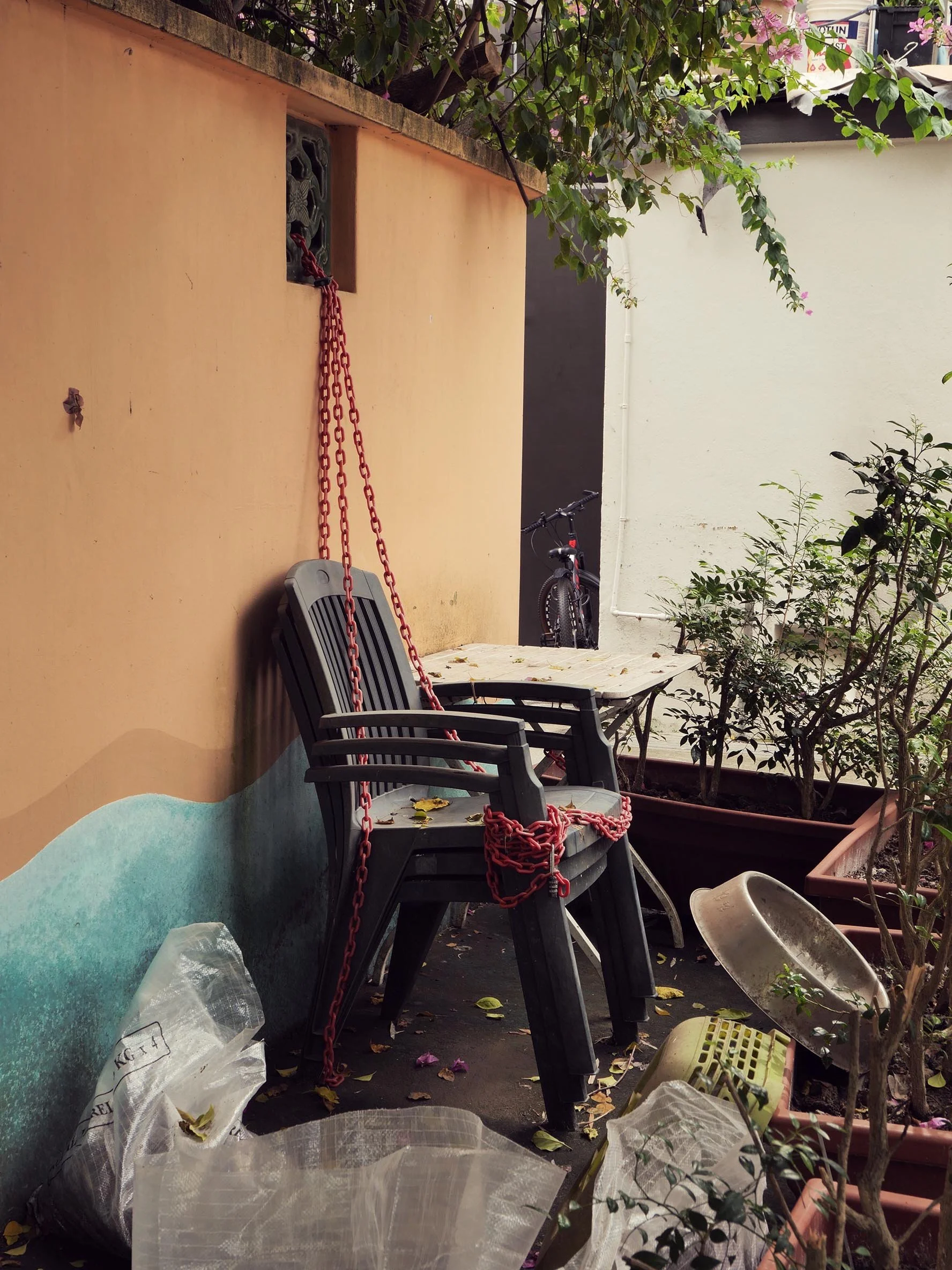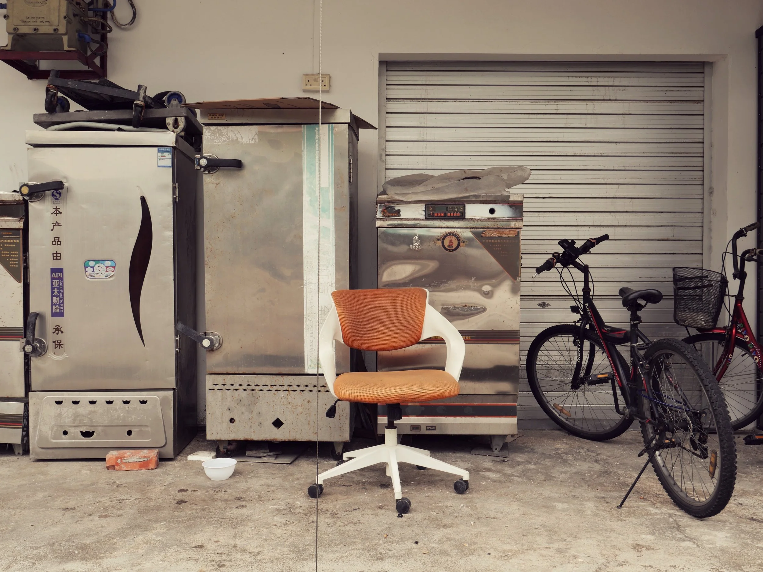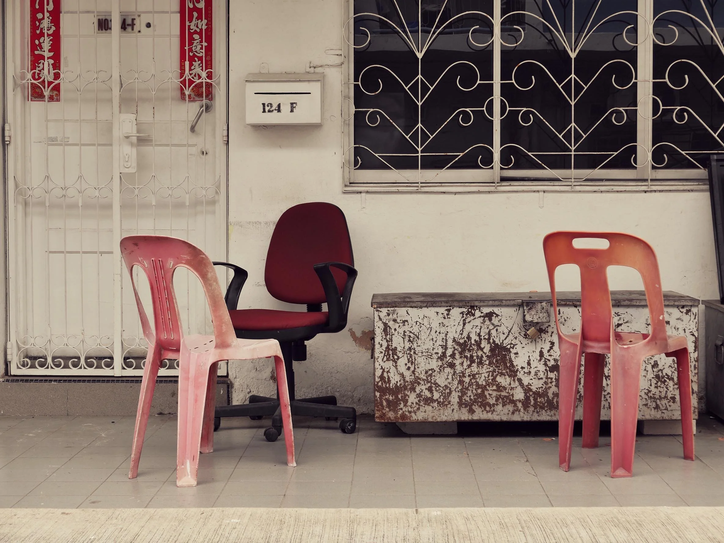 Shifting Seats is a photographic observation of the humble chairs scattered through the backstreets of Singapore. Used by workers during brief pauses in the day such as morning kopi breaks, mid-shift rest or end-of-day conversations, these chairs carry the marks of repeated use: worn plastic, repaired legs, dents, grime, paint rubbed thin.
